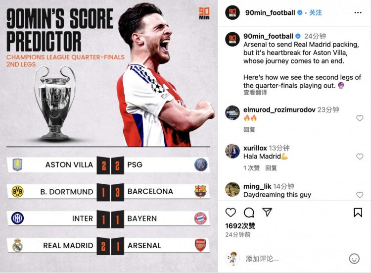 4月15日讯 今晚凌晨,欧冠1/4决赛次回合战火重燃。媒体90min预测了这四场比赛的赛果,90min表示阿森纳将淘汰皇家马德里,而阿斯顿维拉本赛季的欧冠征程也将就此终结。