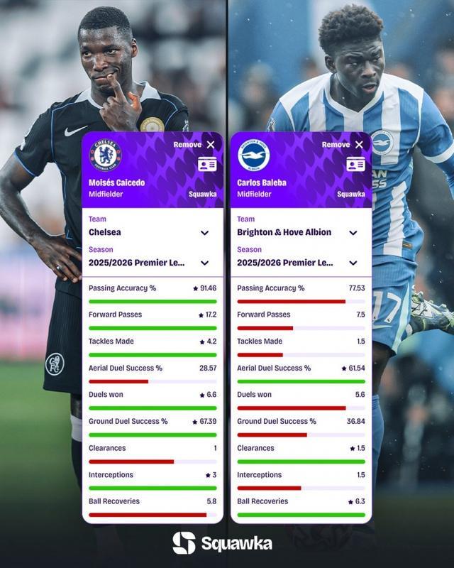 9月26日讯 北京时间明天晚上,切尔西将在英超第6轮比赛中主场对阵布莱顿。Squawka统计了凯塞多、巴莱巴本赛季的英超数据,并做出对比。