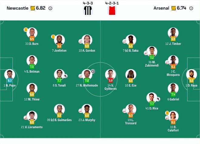 纽卡斯尔首发:1-波普、4-博特曼、12-佳夫、21-利夫拉门托(76’6-拉塞尔斯)、33-丹·伯恩、7-乔林顿、8-托纳利、39-吉马良斯、10-戈登(66’20-伊兰加)、23-雅各布·墨菲(66’2-特里皮尔)、27-沃尔特马德(66’18-奥苏拉)。