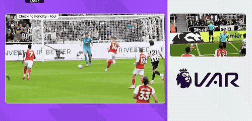 第14分钟,枪手的长传造成纽卡斯尔后防的混乱,墨菲一脚把球踢向本方禁区,约克雷斯机敏插上晃过波普,波普扑救,约克雷斯倒地。VAR介入,裁判认为波普先碰到了球,取消点球。