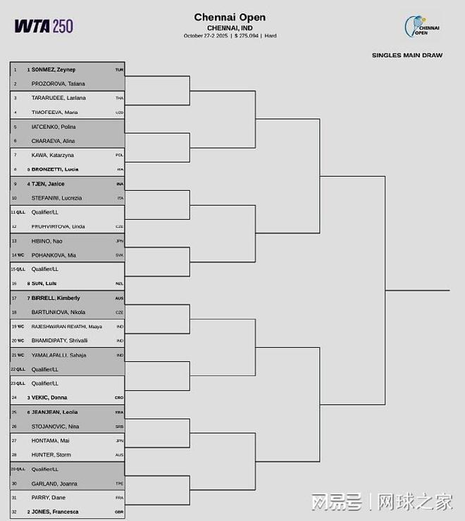 九江站:李吉妮、格鲁比奇、帕克斯、库德梅托娃位列前四号种子。中国有六将出战,其中白卓璇vs李吉妮、朱琳vs 帕克斯、韦思佳vs 邦达尔、朱宸汀vs 塔格尔、郑妩双vs 斯塔罗杜布采娃、袁悦vs资格赛球员。