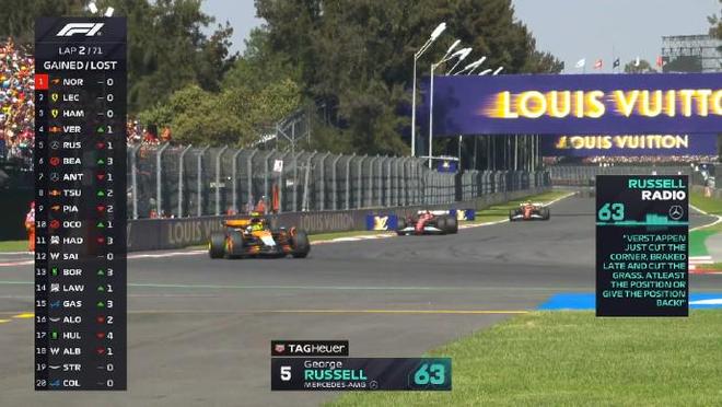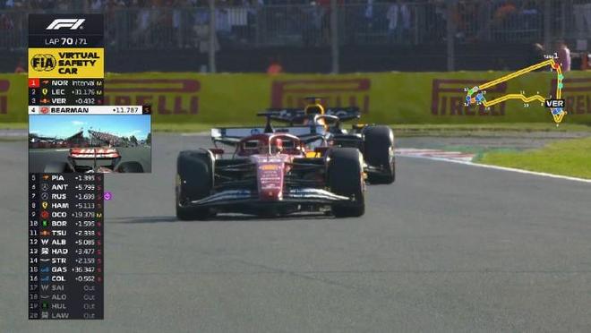 第一圈:首圈后诺里斯顺利领跑,勒克莱尔第二,汉密尔顿第三,维斯塔潘上到P4,皮亚斯特里落到P9