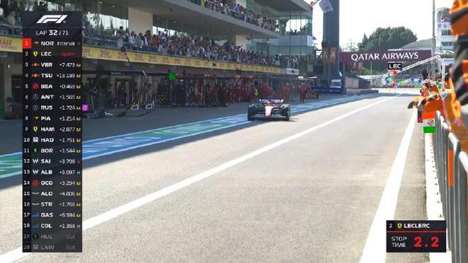 第三十五圈:领跑的诺里斯进站换上中性胎,出站后他仍领先维斯塔潘8秒