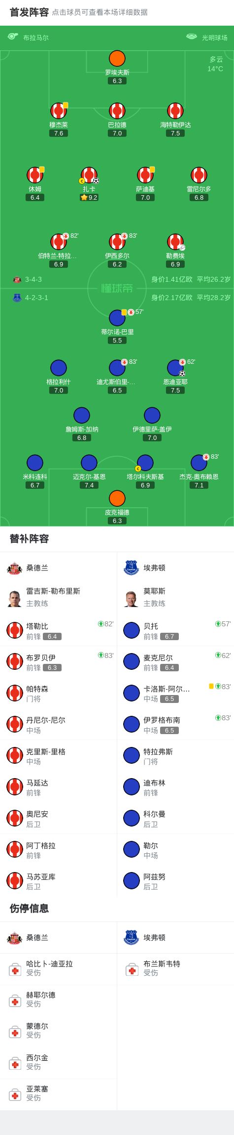 桑德兰11埃弗顿,恩迪亚耶破门,扎卡扳平