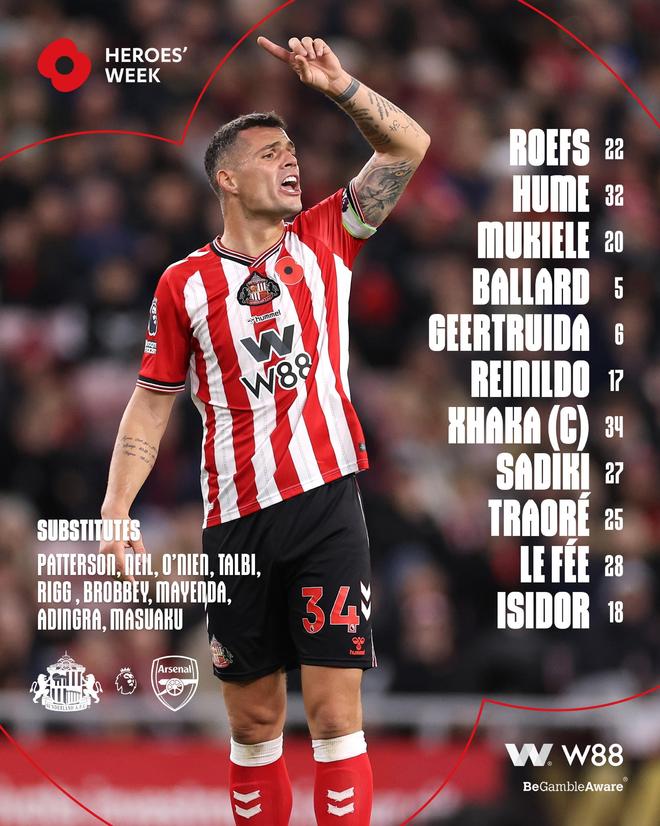 桑德兰首发:22-罗埃夫斯、32-休姆、20-穆杰莱、5-巴拉德、6-海特勒伊达、17-雷尼尔多、34-扎卡、27-萨迪基、25-伯特兰-特拉奥雷、28-勒费埃、18-伊西多尔