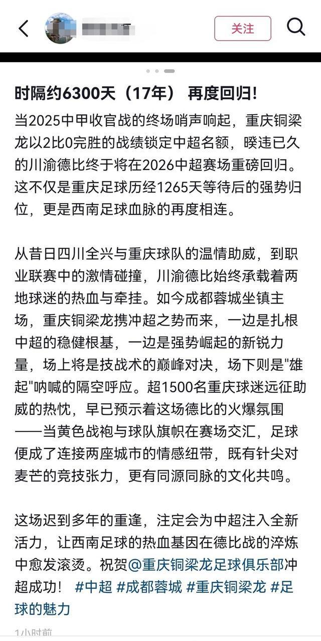 这场跨越地域的期待,还引发了全国球迷的共鸣。IP位于浙江的网友“勇闯天涯”写道:“当2025中甲收官战的终场哨声响起,重庆铜梁龙以2比0完胜的战绩锁定中超名额,暌违已久的川渝德比终于将在2026中超赛场重磅回归。这不仅是重庆足球历经1265天等待后的强势归位,更是西南足球血脉的再度相连。”