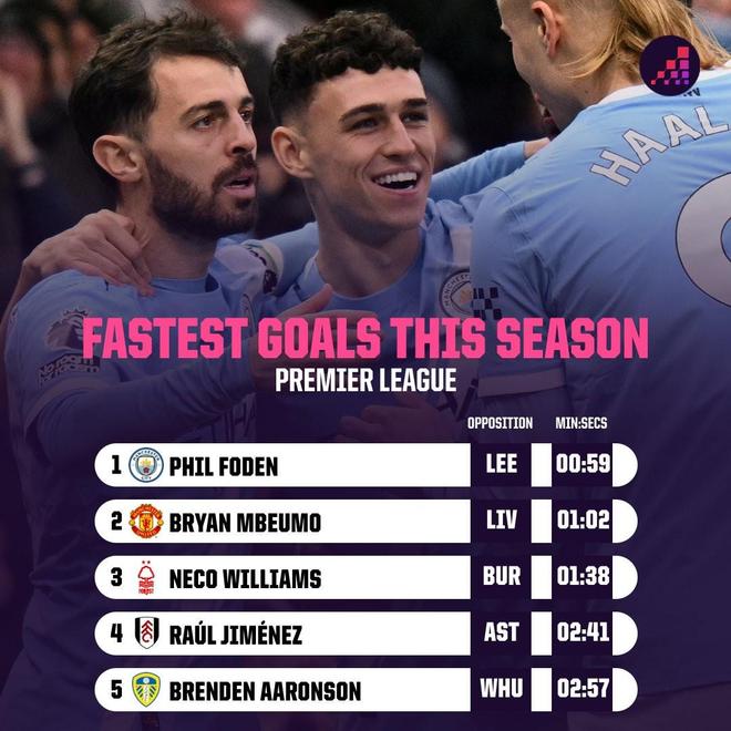 英超第13轮,曼城主场对阵利兹联,开场第1分钟福登破门为曼城取得领先,据统计,这是本赛季英超最快进球,也是首粒在开场第1分钟打入的进球。
