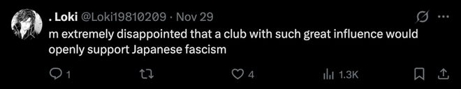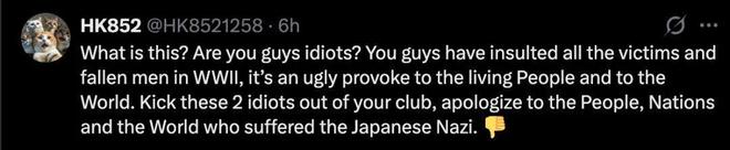 “你们侮辱了二战中所有受害者和阵亡将士,这是对活着的人们以及整个世界的严重冒犯,是对那些遭受过日本纳粹暴行的人民、国家和世界的公然挑衅。把这两个傻瓜赶出你们的俱乐部,向那些遭受过日本纳粹暴行的人们、国家和世界道歉。”
