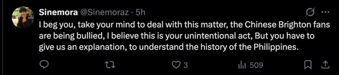 “我求求你们冷静地处理这件事吧。中国的布莱顿球迷正遭受霸凌。我相信这并非你们的本意。但你们必须给我们一个解释,让人们了解菲律宾的历史。”