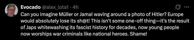 “你能想象穆勒(德国球员)或贾马尔(德国球员)挥舞着希特勒的照片吗?欧洲肯定会彻底陷入混乱!这绝非偶然事件,而是由于日本数十年来对本国法西斯历史的粉饰所致。如今的年轻人竟然把战犯奉为民族英雄,真可耻!”