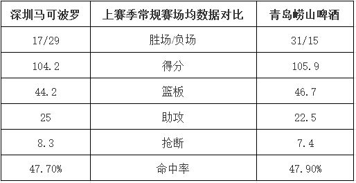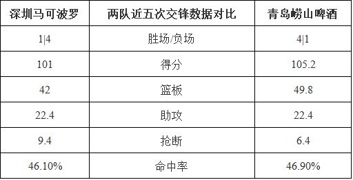 两队数据对比深圳马可波罗与青岛崂山啤酒历史上一共交手37次,深圳马可波罗24胜13负。上赛季两队交手2次,青岛崂山啤酒2胜0负。